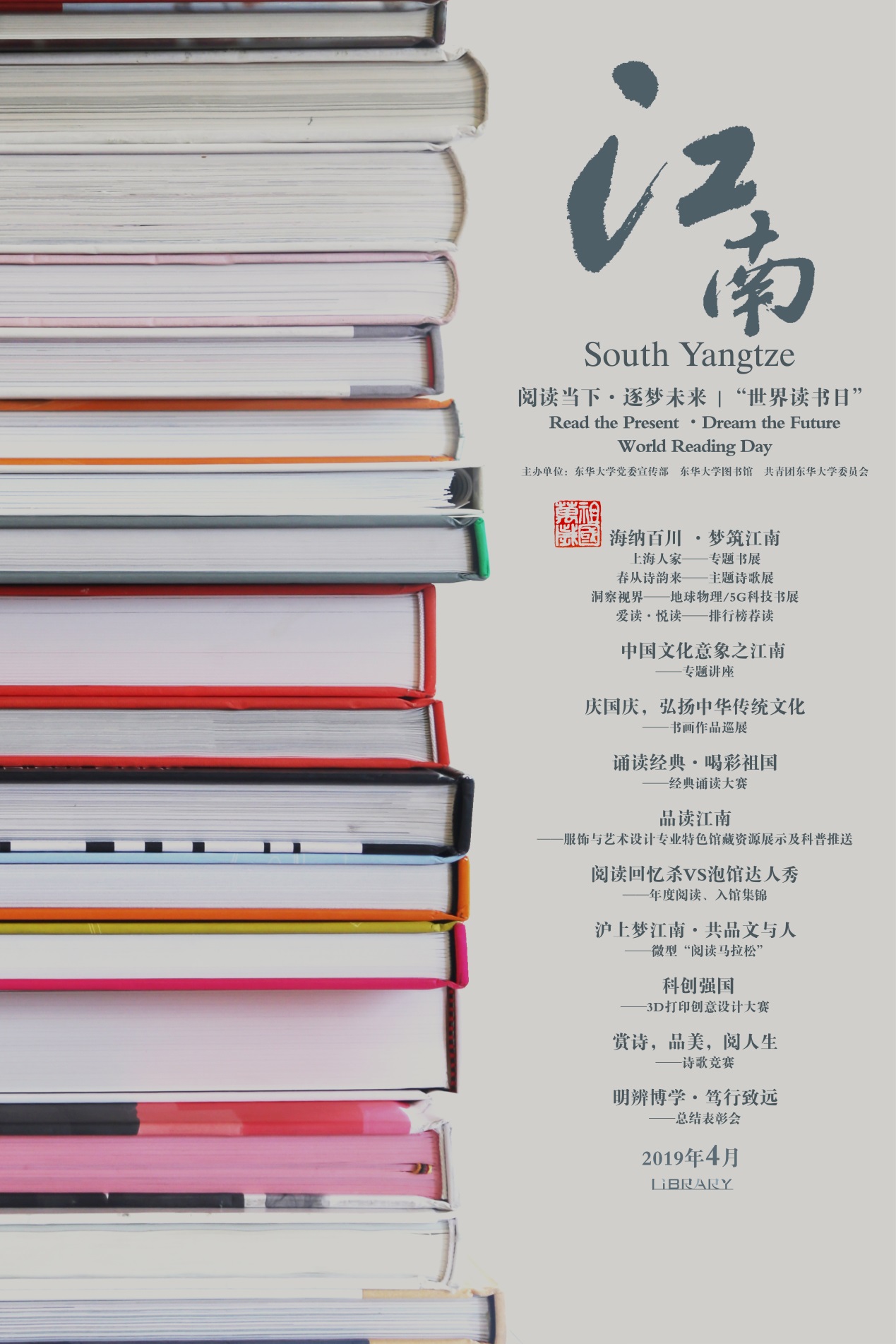 2019年正值新中国成立70周年,适逢“世界读书日”这个书香四溢的时节,由党委宣传部、图书馆、团委共同举办“阅读当下、逐梦未来”——“世界读书日”系列活动,藉此引导师生坚定文化自信,将爱国情、强国志、报国行自觉融入新时代追梦征程。让我们在红色文化的沐浴中,在江南文化的柔情抚慰下,阅读杏花春雨,筑梦申城!