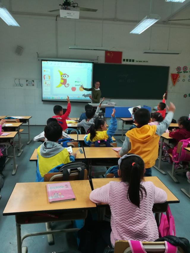 英语课讲师讲了几个水果:苹果,梨,橘子和桃子。讲师把小朋友们分成四组,分别代表这四种水果,当讲师发出指令时,小朋友们要尽快做出反应,反应慢的同学要受到惩罚。游戏进行了两轮,一共有4位小朋友“不幸”受罚,被惩罚的小朋友在讲台上抓耳挠腮,讲台下的小朋友跃跃欲试,十分热闹。