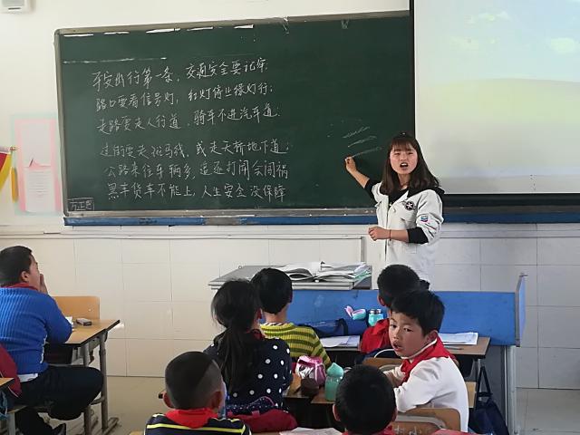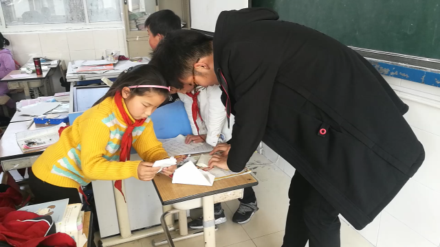 经过短暂的课间,第二节课开始。同学们齐声朗读黑板上的安全歌谣,主讲人强调安全事项,介绍写信的格式。活动最后,是同学们最期待的手工环节,志愿者们一步步耐心细致的指导,教同学们叶子信封的折法。