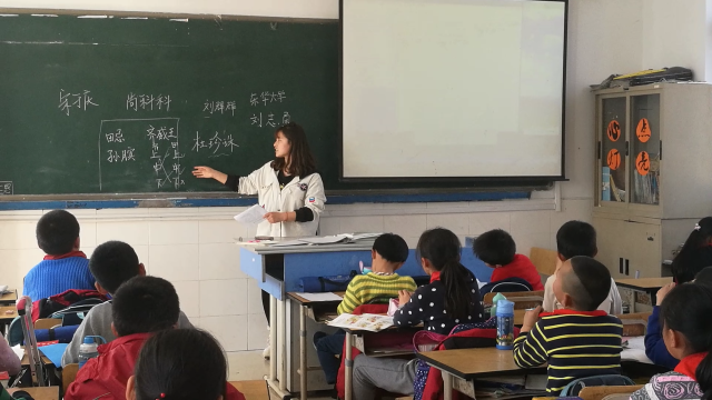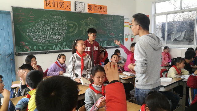 抵达马汤村小学后,志愿者们在会议室准备分工。一部分志愿者作为主讲人讲授课程,其余的志愿者则负责帮助维持课堂纪律。铃声响起,志愿者们分为两队来到三年级的两个班级,在同学们做眼保健操时写好板书。