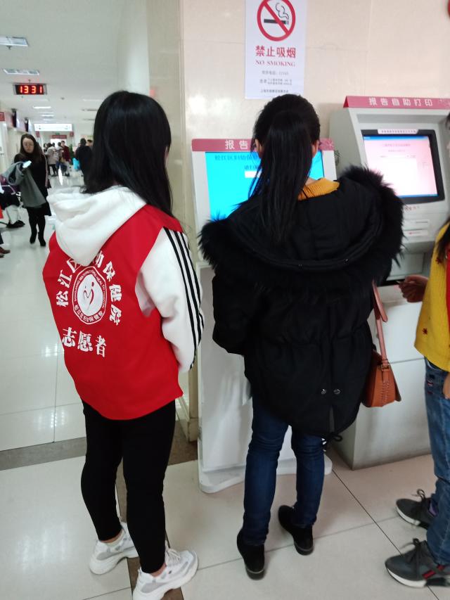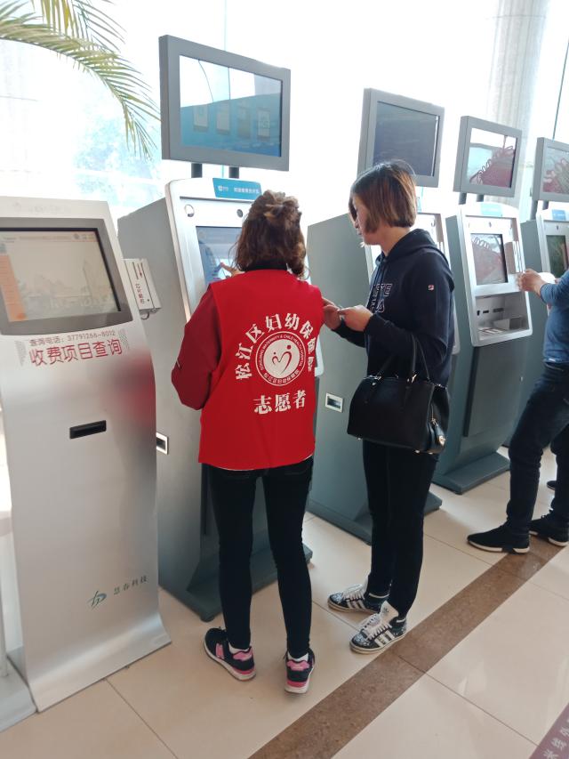 在队长和负责护士的带领下,每个队员都拿到了红色的志愿者工作服,在放好了背包和雨伞,进入医院大厅后,队长和义工阿姨经过商讨,分配给了每一位队员一个岗位,有在自助挂号机前帮助前来就医的孕妇挂号的,也有站在人工挂号处进行引导的,还有安排前来参加讲座的准妈妈和准爸爸对号入座听课的。通过一个多小时的志愿工作,同学们都渐渐熟悉了手头上的工作,经过简单的总结,每个人都了解到了妇幼保健医院的就医步骤:一般就医人员进入医院后,有两种挂号途径,一种是人工现金挂号,一种是机器自助挂号。分管到机器自助挂号的三名同学,各司其职,耐心地给每个人讲解挂号步骤,遇到他们也无法解决的棘手问题时,就立即向义工阿姨求助。如果是自助挂号解决不了的问题,则会引导其到服务台咨询或者去人工窗口挂号;如果是听课的准爸爸和准妈妈,则会有志愿者带他们去咨询台询问相关课程的开设地点,再由相关课程点的志愿者引导其对号入座。一个小时过去了,每个人都不松懈,在有条不紊的工作中结束了今天的志愿者活动,虽然工作的时间不算长,工作的内容也比较简单,但是在这个过程中没有人懈怠,每一个人都在尽力做好手头上的工作,亦可谓收获颇丰。