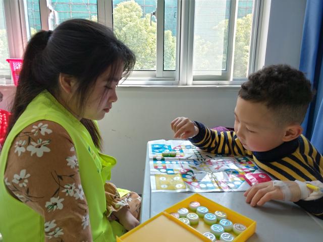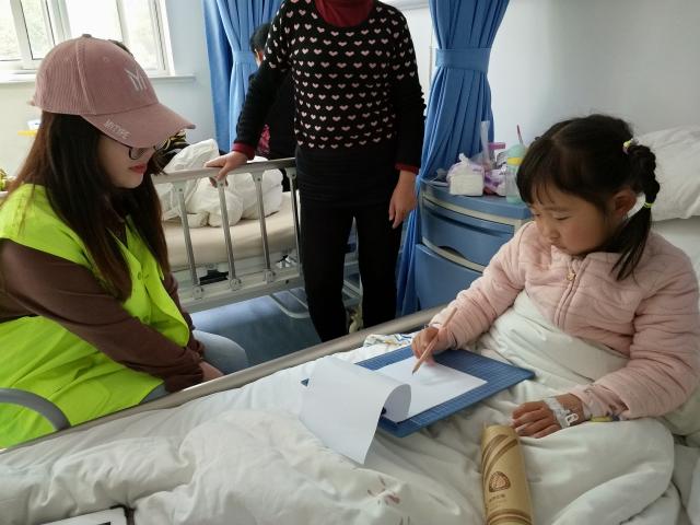 走进病房,有的孩子,家长正在教识字、教辨色,孩子一脸紧张。有的正在输液,脸上透着迷茫。但当他们看见队员们时,无不眼里闪过光。有一个孩子甚至在队员们未走进门时就害羞地站在门旁,小心翼翼地睁大眼睛巴望着队员们,眼里透着害羞与盼望。短暂的陌生过后,孩子们和队员们都进入了状态。积木、故事、绘画、滑板……病房里很快充满了欢声笑语。队员们也在这稚嫩的笑声中,慢慢卸下了疲惫,变得柔软,仿佛回到了童年。