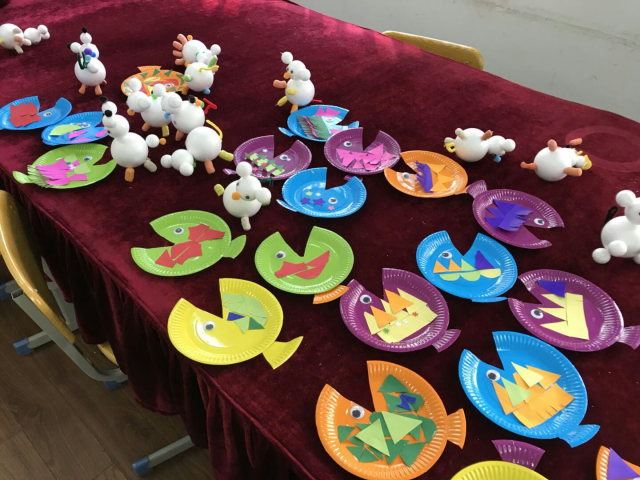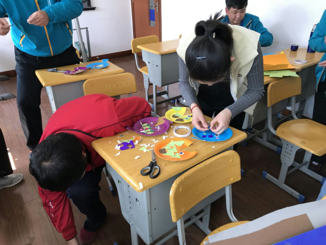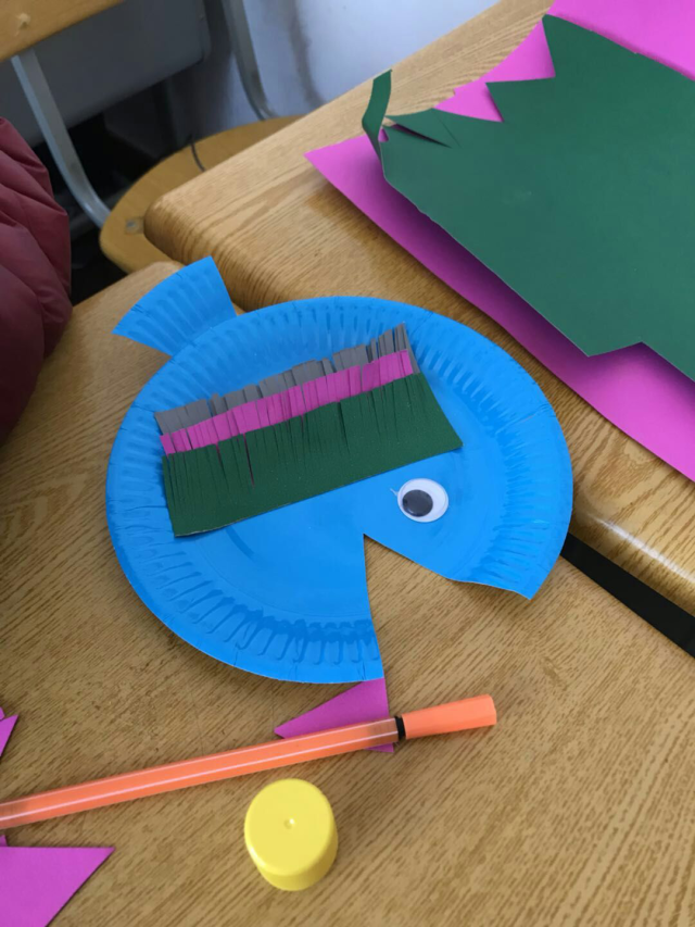 今天教她们学习制作“纸盘鱼”。首先每个人都在座位上安静坐着,我们分发材料,有纸盘、剪刀、胶棒、鱼眼睛、卡纸……每个人拿到材料后都跃跃欲试~我们先在黑板上大概讲了一下,接下来手动一步步耐心的教学。她们很愿意去学习,去制作,有的不会的或者做不好的,我们会及时帮助她们,一步步引导她们,她们也都很有礼貌“谢谢老师!”或者高声呼喊着“老师,你看我做的对吗?”“老师,我做完啦!”教室里,声音此起彼伏。