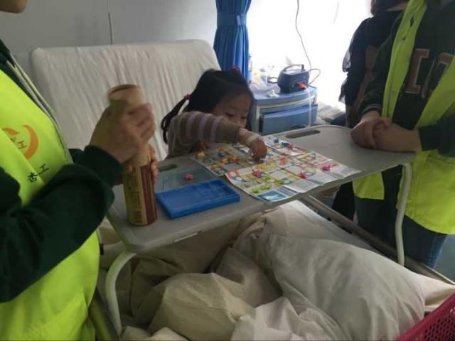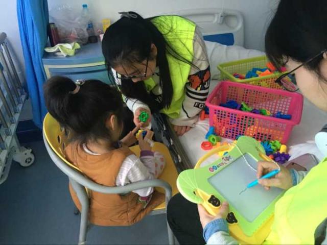 病房里,年幼的小男孩头上贴满了医学胶带,因为打针而哭泣过的双眼仍然红肿着,眼睛里泛着晶莹的泪光。年仅四岁的小女孩打着点滴,安安静静地坐在病床上,不时向窗外张望着,也许是在期盼着早日出院后回到大自然的怀抱里,享受春风的和煦和春光的温暖。看到队员们到来,孩子们起初感到有些陌生,脸上却又有着抑制不住的欣喜。队员们陪伴着年幼的孩子们,彩色的积木一块块被搭建起来,搭建出漂亮的房子,彩色的手枪和高耸的古塔。孩子们也逐渐从拘谨到熟悉,璀璨的笑容不断绽放,清脆的笑声回想在沉寂无声的病房里。