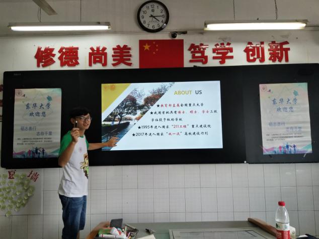 实践团成员在规划资助政策宣讲时,联系到了原先马房山中学的同届东华学生周同学配合实践队完成这次任重道远的高校宣讲。实践团成员到达马房山中学后,首先进入教室张贴了之前的海报,并发放宣传册,提前到达的成员们进行场地熟悉的演练,希望给同学们带来一次对东华有印象,对国家资助政策有期许的宣讲。