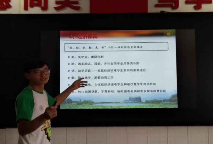 下午五点宣讲正式开始。本次宣讲从吃、喝、住、学等四个方面展开介绍东华。实践团成员在讲解资助政策方面点面结合、在介绍东华时粗中有细。从大的角度例如未来学习、毕业后工作等角度讲解东华的特色,从小的生活点点滴滴诙谐幽默的细节给同学们铺陈出一条神往的道路。