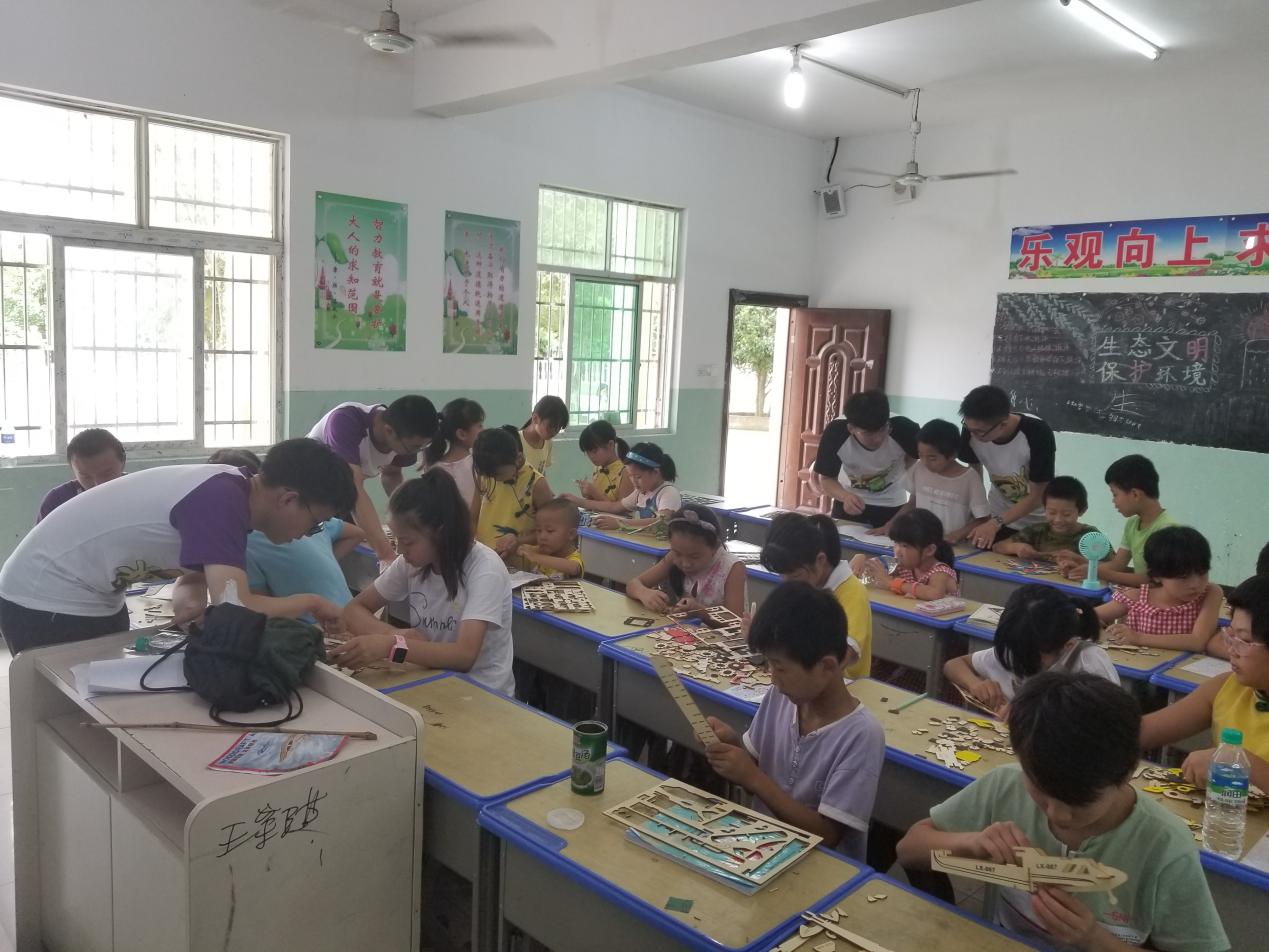 上午八点半实践团开始了支教活动,首先开展手工课,教小朋友拼一些简单的模型,增强小朋友们的动手能力以及合作能力。课程开始,实践团安排两到三名小朋友一组,并且有一位实践团的队员负责解决拼模型中遇到的困难。小朋友们在刚开始拼模型时,心情十分的激动,并且非常的认真,但随着模型的模块越来越复杂,需要更加专注时,小朋友们就有些失去信心了。这时候实践团的队员们细心指导小朋友们,教他们拼模型的步骤,以及步骤的先后顺序。这样,他们终于找到了拼模型的方法,也完成了模型的拼接。拼接完成后,他们增强了自己的自信心,同时他们也更加相信实践团的哥哥们。他们在拼完模型时,也有了成就感,体验到了拼模型的乐趣。