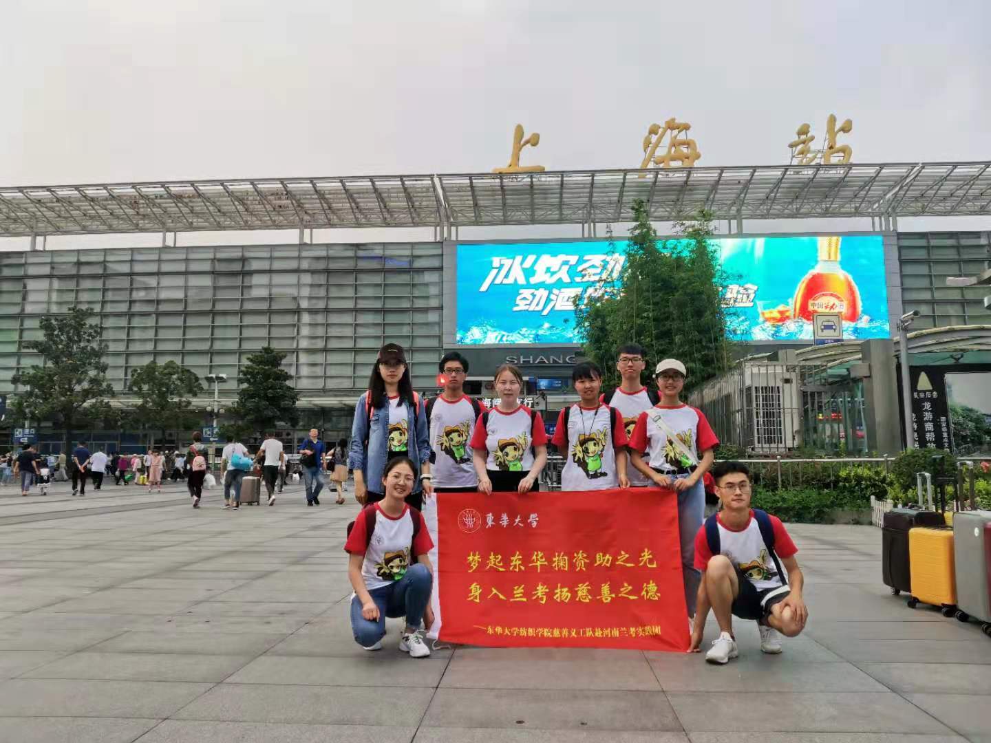 2019年7月11日,东华大学爱心屋慈善义工队赴河南实践团的社会实践活动正式拉开了序幕。结束了出发前出征小视频的录制,实践队一行人背上行囊,肩负使命,踏上去往河南兰考的道路,身穿整齐的红色东华队服,手中紧握着载满兰考贫困学子希望的行李箱,眼中满是坚毅自信的目光,落实宣传国家资助政策,投身社会实践,实现青春梦想,发扬东华学子精神风貌,我们永远在路上。