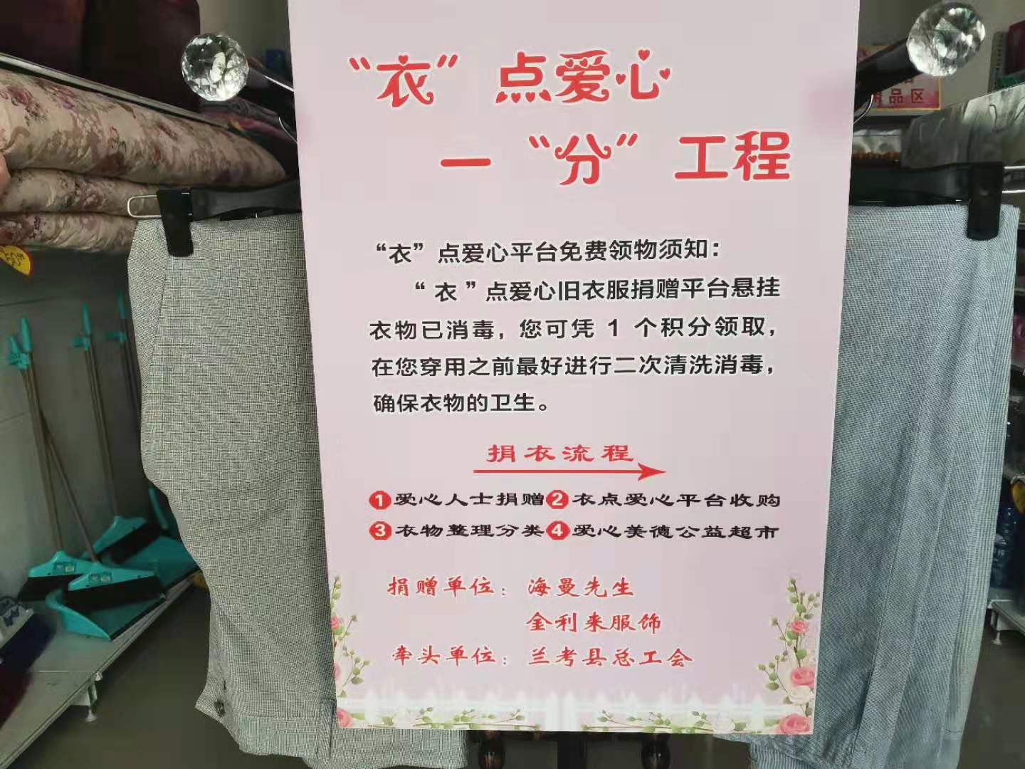 流动的超市,不变的温暖。兰考县委统战部创新机制,围绕中心,服务大局,成立光彩事业服务中心,引导爱心人士、爱心企业、社会团体对光彩事业认筹。光彩事业为爱心超市提供爱心资金,建立社会扶贫捐赠奖励体系。此外,爱心超市也接受个人、家庭、社会捐赠。爱心超市会对捐赠物品进行登记、整理、清洗、消毒、发放,并接受社会各界监督。麻雀虽小,五脏俱全,爱心超市虽然不大,但生活用品、学习用品、家用电器应有尽有。