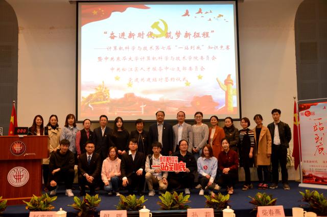 4月17日下午,中共东华大学计算机科学与技术学院委员会与中共松江区人才服务中心支部委员会结对共建签约仪式暨第七届“一站到底”知识竞赛在图文信息中心第二报告厅举行,松江区人才服务中心主任倪晖,副主任柴春燕、王俊,计算机科学与技术学院党委书记孙莉,学生处副处长赵彦明,上海曼恒数字技术股份有限公司人事总监杨婷,上海中仿信息科技有限公司人事经理杨可,校党委组织部组织员赵北琳莅临活动现场。活动由计算机学院党委副书记李华婷主持,计算机学院党建组织员、党建辅导员、全体学生党员、入党积极分子、发展对象和松江区人才服务中心党支部全体党员参与了本次活动。