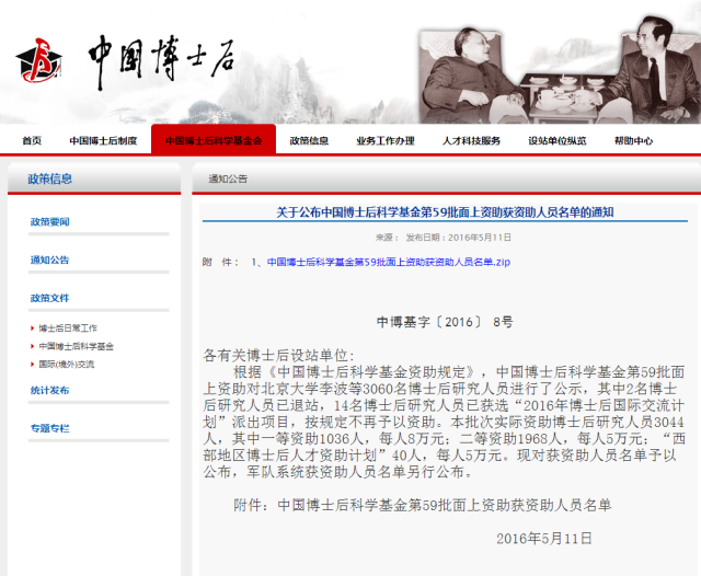 日前,中国博士后科学基金会公布了第9批特别资助和第59批面上资助的博士后名单。我校共有10名博士后获得资助,其中2名博士后获得了特别资助, 8名博士后获得了面上资助,并且这10人中有7人是师资博士后。(名单见下表)