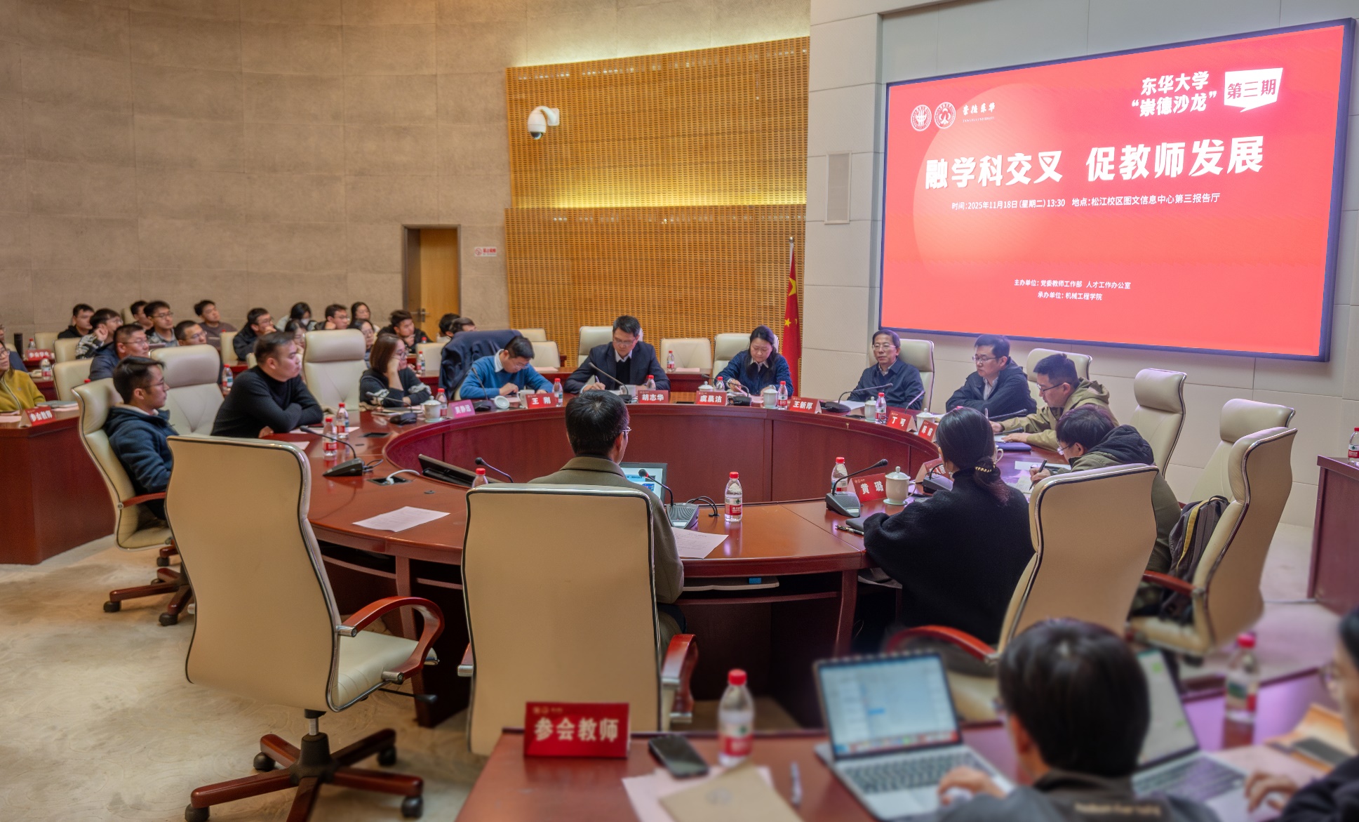 11月18日,第三期“崇德沙龙”在松江校区举办。本次由党委教师工作部、人才工作办公室主办,机械工程学院承办,活动以“融学科交叉,促教师发展”为主题,四位来自不同学院的专业教师聚焦集成电路相关领域前沿进行主题分享,吸引了各学院青年教师积极参与。活动由机械工程学院党委书记王新厚主持。