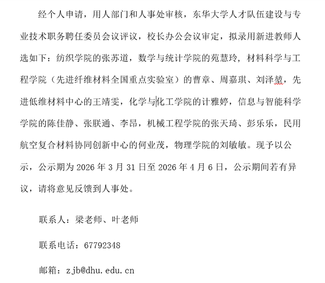关于拟录用新进教师人选张苏道等14人的公示