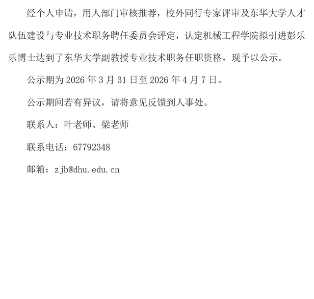 彭乐乐博士高级专业技术职务任职资格公示