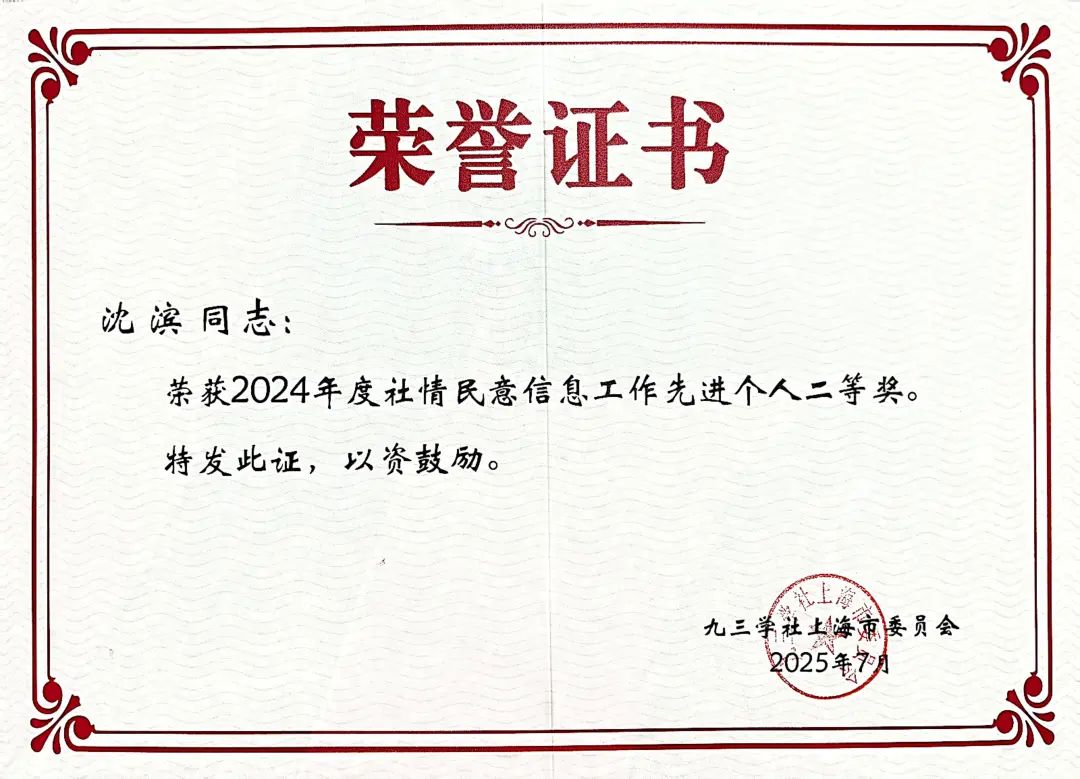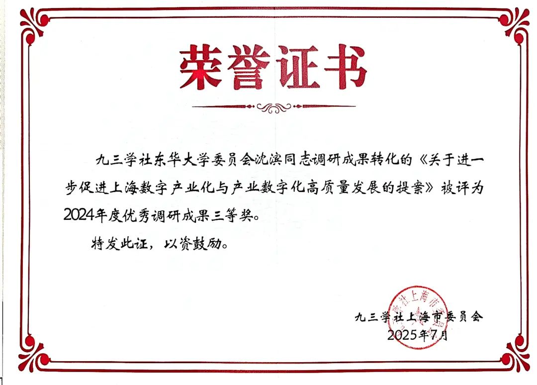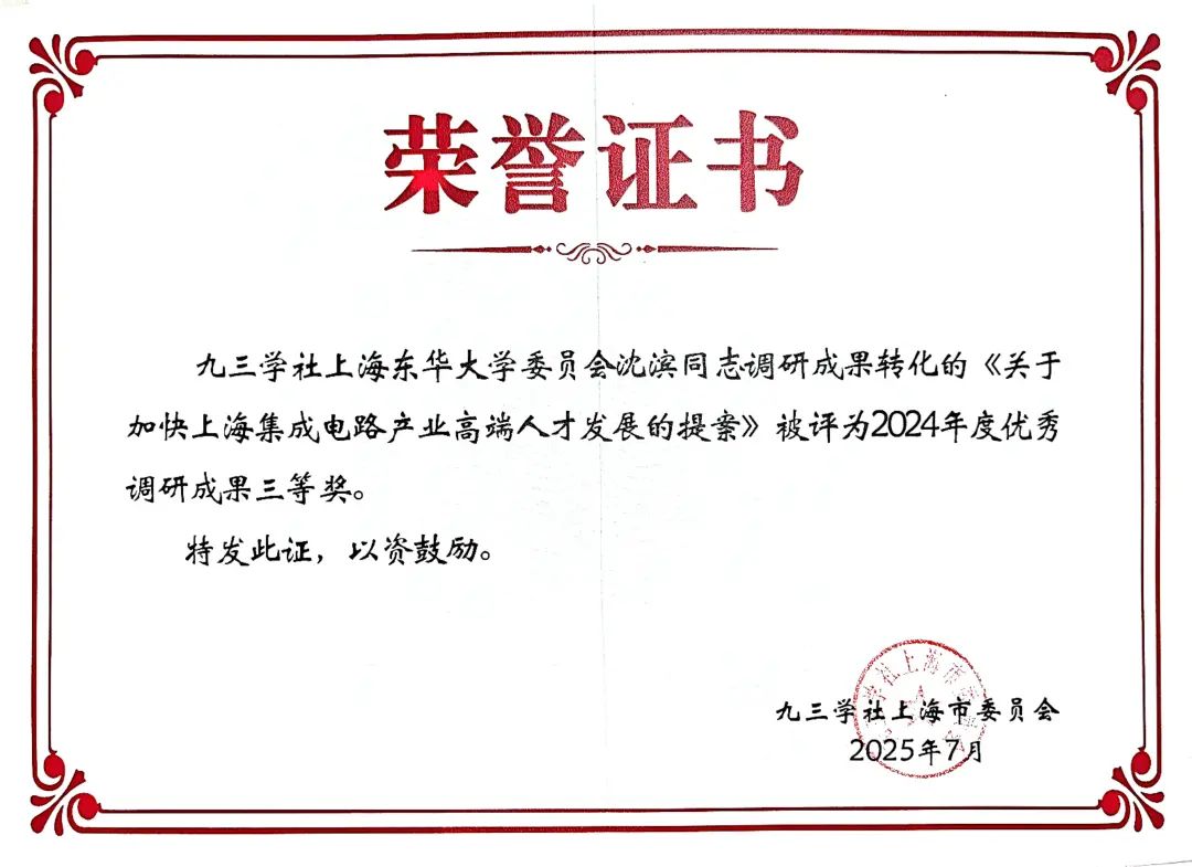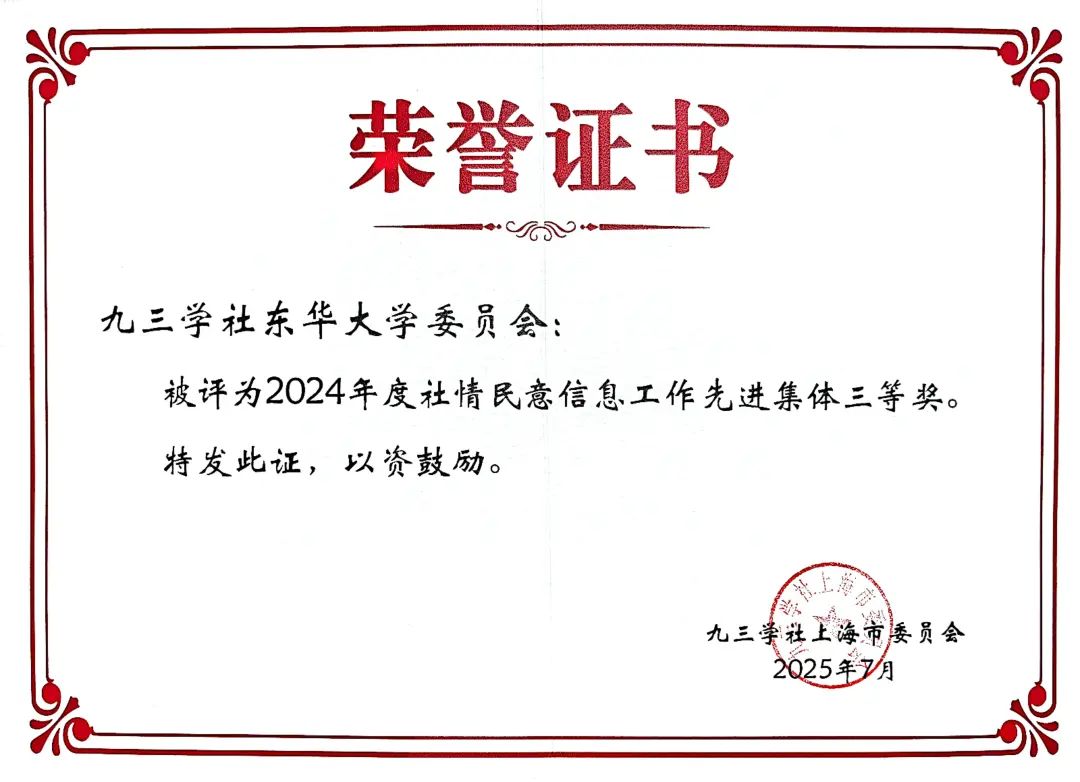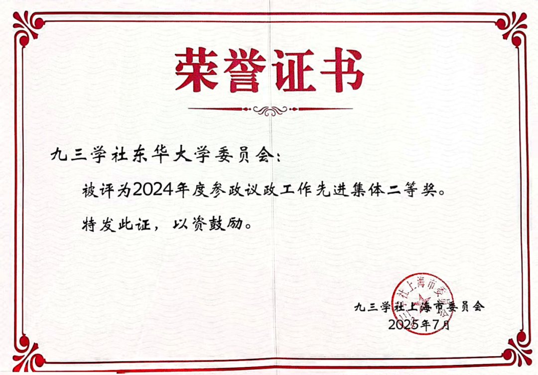 九三学社东华大学委员会获“2024年度参政议政工作先进集体二等奖”和“2024年度社情民意信息工作先进集体三等奖”。九三学社东华大学委员会副主委、管理学院副院长沈滨教授获“2024年度社情民意信息工作先进个人二等奖”,其撰写的《关于加快上海集成电路产业高端人才发展的提案》《关于进一步促进上海数字产业化与产业数字化高质量发展的提案》获评“2024年度优秀调研成果三等奖”。