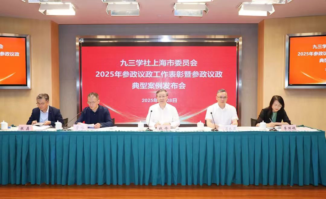7月28日下午,九三学社上海市委在民主党派大厦召开2025年参政议政工作表彰暨典型案例发布会。市政协副主席、社市委主委钱锋出席并讲话。会议根据《关于表彰2024年度参政议政工作先进集体和个人的决定》,对先进集体、优秀调研成果及先进个人等进行表彰。