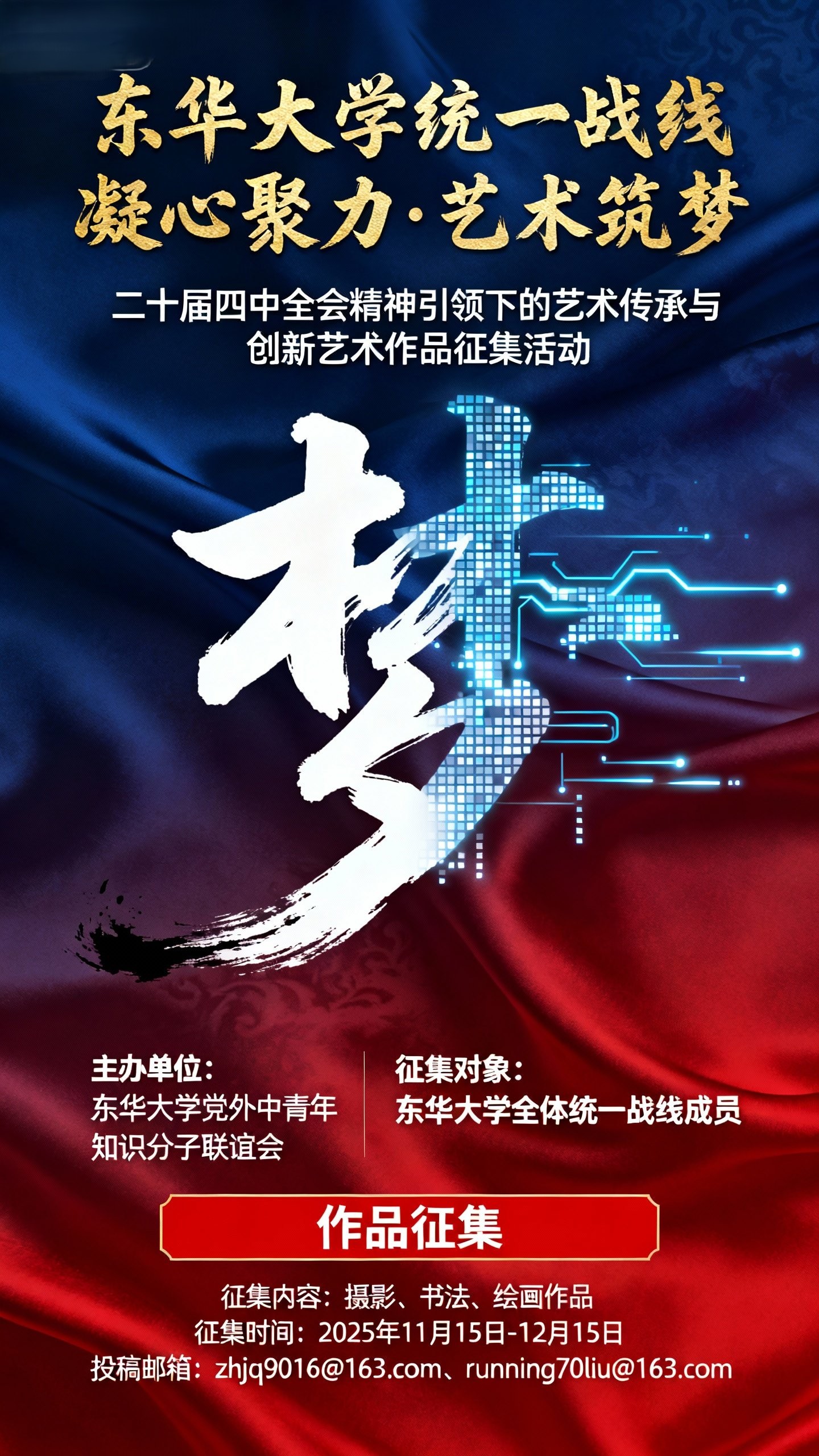 为深入学习贯彻党的二十届四中全会精神,切实把广大党外知识分子紧密团结在党的周围,东华大学党外中青年知识分子联谊会联合全校各民主党派与统战团体,共同开展“凝心聚力·艺术筑梦”——中共二十届四中全会精神引领下的艺术传承与创新作品征集活动。本次活动以艺术为载体,生动展现新时代统一战线在党的领导下所彰显的新气象、新担当与新作为,进一步弘扬党的优良传统,凝聚共识,汇聚人心,集聚智慧,为全面建成社会主义现代化强国、实现中华民族伟大复兴贡献艺术的温度与力量。