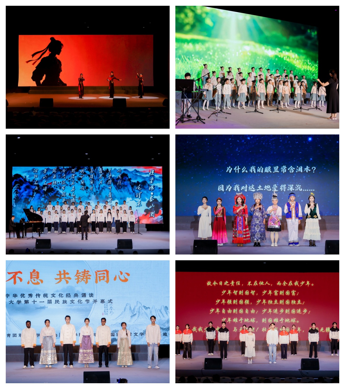 随后,中华优秀传统文化经典诵读精彩上演。演出分为“序章”“爱国·流转千年”“抒怀·精忠报国”“童声·代代传承”等八个篇章,涵盖经典诵读、武术、京剧、合唱、民族歌舞等多种形式,展现了中华文化的博大精深与各民族文化的交融共生。来自校内外的师生、社区居民及附属实验学校学生共同参与,以声传情、以艺凝心,为现场观众带来一场充满文化底蕴与时代气息的视听盛宴。