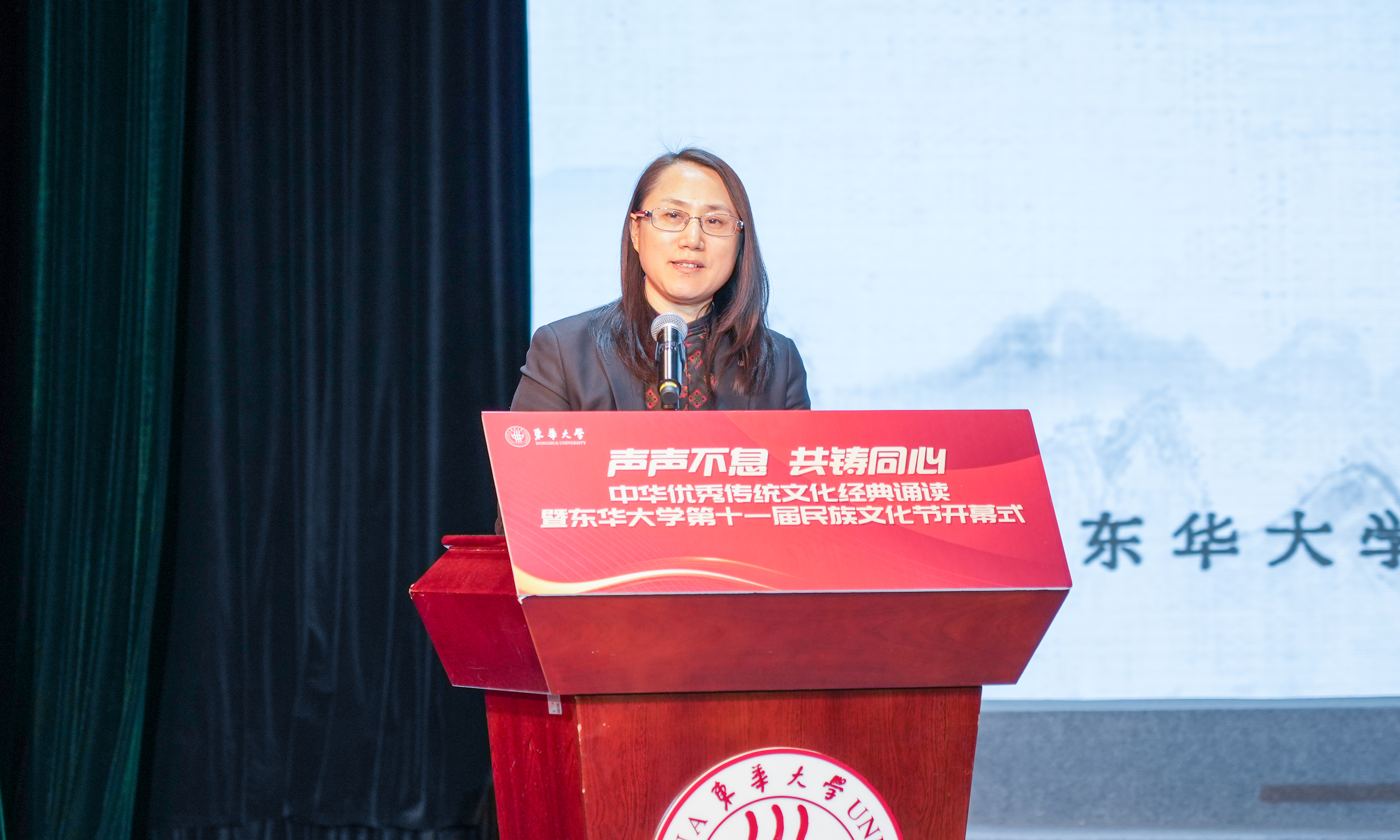 11月18日,东华大学在锦绣会堂隆重举行“声声不息、共铸同心”中华优秀传统文化经典诵读暨第十一届民族文化节开幕式。上海市民族和宗教事务局副局长毛俊,松江区委常委、统战部部长朱大章,东华大学党委副书记王治东等领导出席活动。市民族和宗教事务局、松江区民宗办、团区委、广富林街道、区民族联、区民族团结进步协会、民促会以及学校民族宗教工作领导小组成员单位负责人、民族联骨干、师生代表,社区居民、东华附校师生等六百余人共同参与。