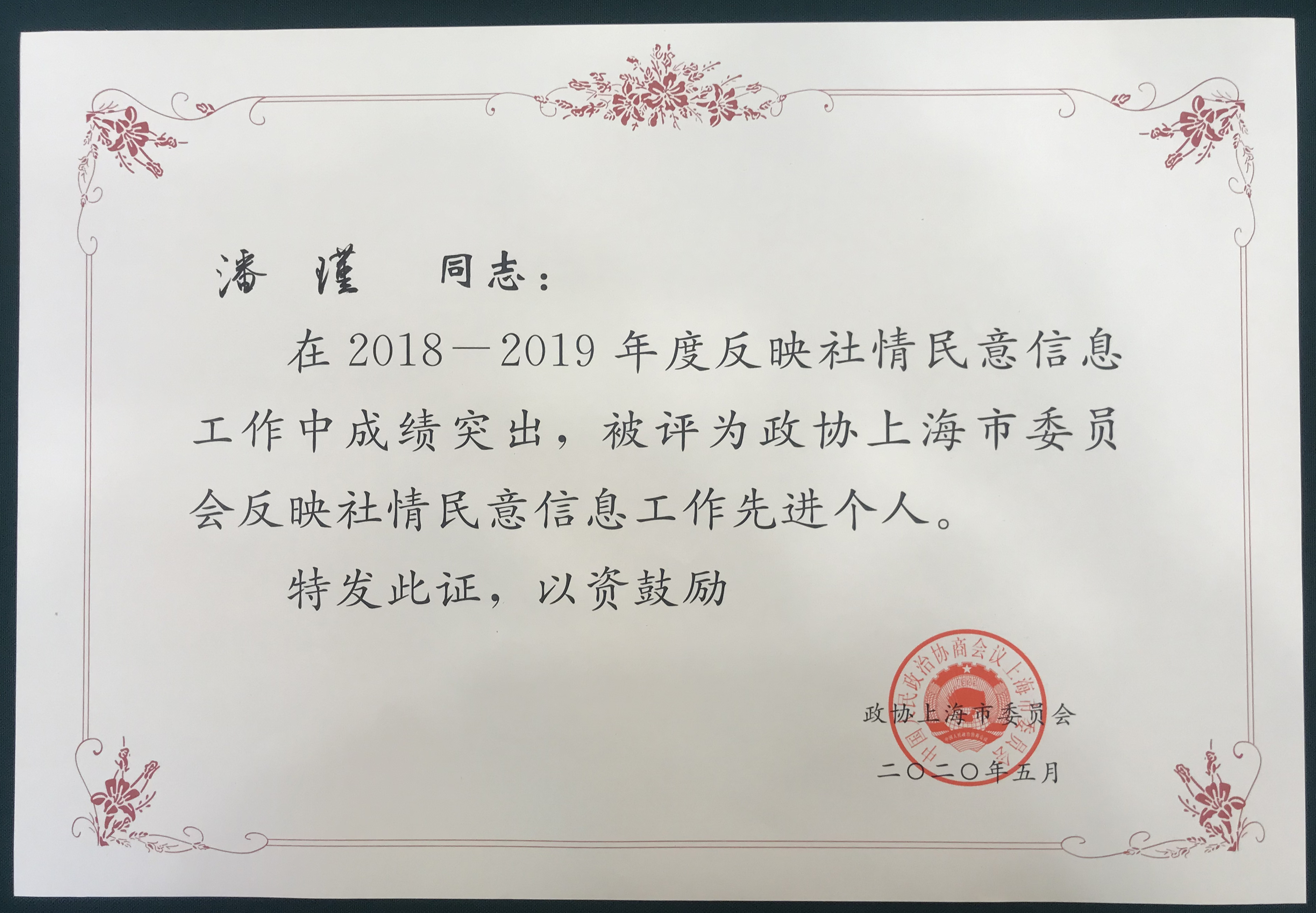 5月13日,上海市政协召开社情民意信息工作会议,深入贯彻中央和市委政协工作会议精神,总结经验、明确思路,就进一步做好反映社情民意信息工作作出部署。会议表彰了反映社情民意信息工作先进单位、先进个人。市政协委员潘瑾获得先进个人(全市共20名,含在沪全国政协委员),继“2015-2016”年度后再获殊荣。
